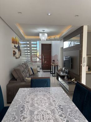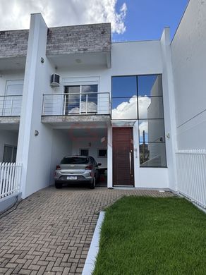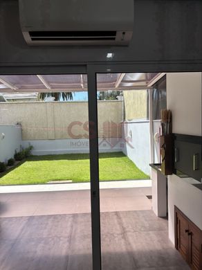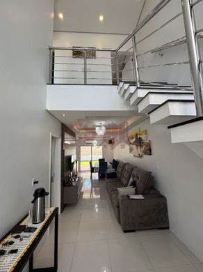 Belo sobrado com 03 dormitórios com sacada, sendo 01 suíte, banheiro social no andar superior, no andar térreo, hall de entrda c/ pé direito duplo, lavabo, sala de estar com rebaixo de gesso, espaço de jantar integrada com a cozinha toda sob medida, lavanderia, espaço gourmet na área externa, pátio gramado nos fundos, imóvel com pisos em porcelanato e laminado, aberturas automatizadas, forro com laje e gesso, água quente, placas fotovoltaica.